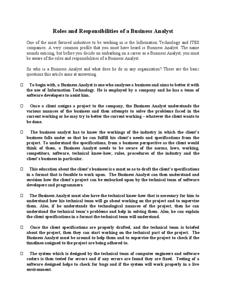 The formal definition of a business analyst according to iiba is any person who performs business analysis activities, no matter what their job title or organizational role may be (yes, that simple!). There are many business analysts who help the business improve the operational procedures, or business processes, or financial structure. A fundamental responsibility of a business analyst is to work in accordance with relevant project stakeholders to understand their requirements and translate them into details, which the developers can comprehend. Role and responsibilities financial analysts play a critical role in an organization's daily operations. • defining and documenting customer business functions and processes • identifying, defining and documenting business needs and objectives, current operational procedures, problems, input and output requirements and levels of systems access after consulting with functional unit management and personnel